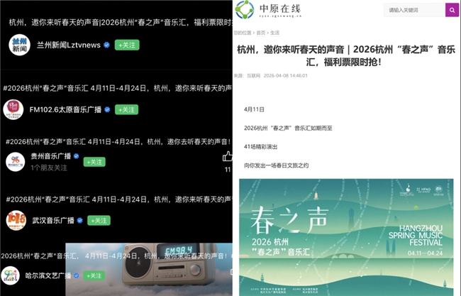 2026杭州“春之声”音乐汇围绕“听见,杭州的春天”主题口号,构建“线上引流-线下体验-消费转化”全链路传播营销体系,联动各级各类媒体80余家,发布新闻、短视频等宣传内容200余条,实现全网总曝光超6000万次。